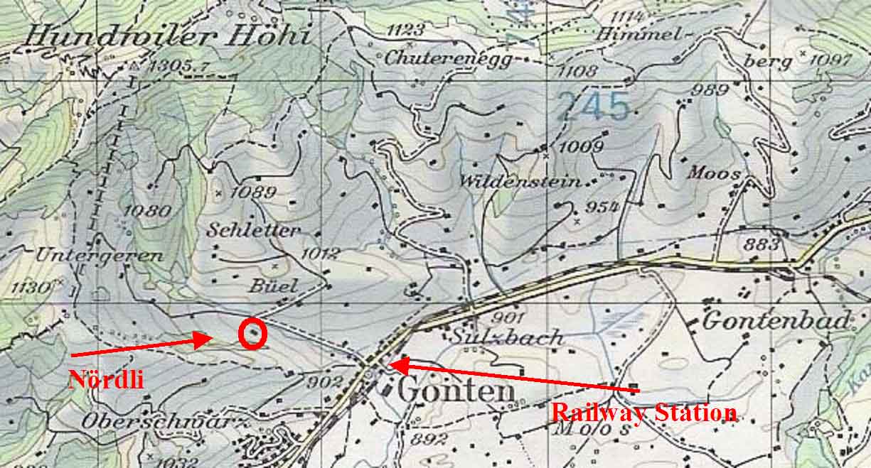 Map of Gonten with Railway station and Hut. From the railway station you have to cross the main road and walk up the little aspalt road about 600 m and after the bridge, turn left. Here you are. |