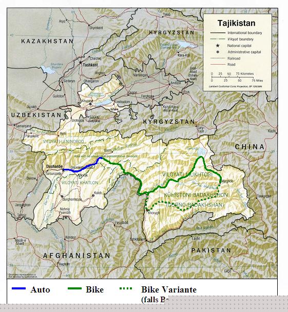 Bevor es richtig los geht fahren wir rund 200 km mit dem Begleitauto von Dushanbe nach Faizabad. Dieser Abschnitt ist noch relativ flach und vergleichsweise wenig spektakulär und zudem ziemlich befahren. Ab Faizabad gehts per Mountainbike über den ersten atemberaubenden Pass südlich zur afghanischen Grenze nach Kala-i-Khumb. Anschliessend fahren wir weiter entlang dem Grenzfluss Pansch während rund 200 km bis Rushan. Bei Rushan biegen wir ins Bartang Tal ein und verlassen die Sicht auf die zahlreichen afghanischen Dörfer. Das Bartang Tal soll gemäss Lonely Planet eines der schönsten Täler des Pamirgebirges ein. Die Strasse ist eng, steinig und langsam steigend während weiteren rund 200 km. Falls das Bartang Tal wegen Schnee nicht befahrbar sein sollte, weichen wir aus auf den Pamir Highway. Dabei würden wir den Hauptort (Khorog) der Provinz Gorno-Badachschan passieren und weiter auf relativ guter Asphaltstrasse durch das Pamirgebirge radeln. Nach rund 150 km ab Khorog überqueren wir auf dieser Variante den höchsten Punkt mit 4'284 m ü. M. Anschliessend weitere rund 200 km auf herrlicher Hochebene. Das Ziel der Reise, Murghab, eine junge ex-sowjetische Siedlung (ca. 3'000 Einwohner) im Osten des Pamirs auf einer Höhe von rund 3'600 m ü. M., umringt von 6'000 und 7'000-er Gipfel, geprägt von Yaks und Marco Polo Schafen, bietet Erholung und viele Möglichkeiten von Tagesausflügen. Die Route per Mountainbike beträgt rund 900 km (bzw. 800 km für die Ausweichroute über den Pamir Highway). Von Murghab gehts zurück nach Dushanbe mit dem Begleitfahrzeug.